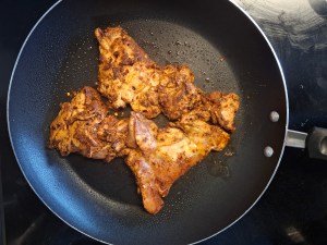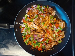 - Prep chicken and veggies: Wash and trim chicken thighs. Coat with all seasonings. Chop up the peppers and onions.