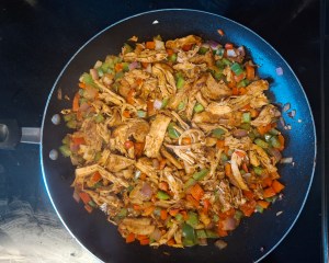 - Cook chicken and veggies: Spray a skillet with cooking spray and cook chicken over medium heat. Add peppers and onions and shred chicken as it cooks. If needed, add 2–3 tbsp water or broth to add in more moisture.