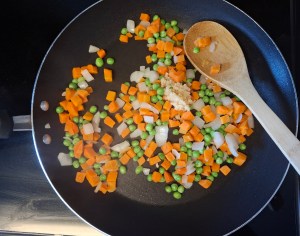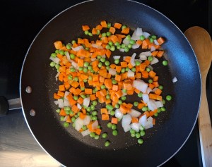 1. Sauté the veggies: In a skillet over medium heat, add nonstick spray. Toss in peas, carrots, and diced onion. Sauté until the onions turn translucent (about 4–5 minutes).