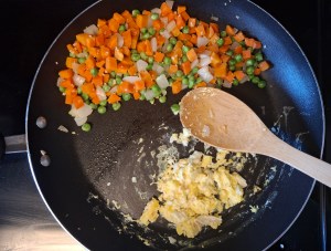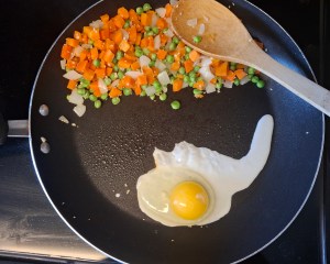 1. Scramble the egg: Push veggies to the side and crack in the egg. Scramble, then mix together.