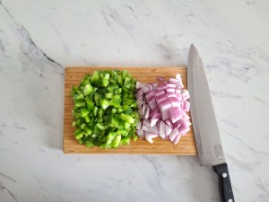 - Prep veggies: Dice your green pepper and red onion.