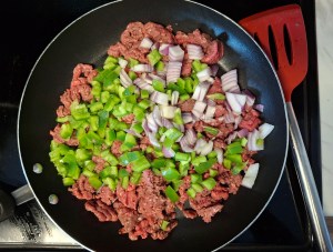 - Cook the beef: In a nonstick skillet over medium heat, cook the ground beef, peppers, and onions until meat is nearly browned.