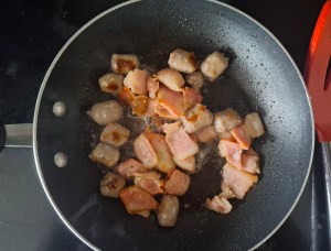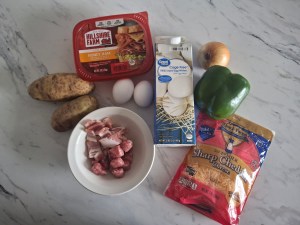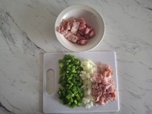 - Cook meats: Cut bacon, sausage, and ham. In a skillet coated with cooking spray, cook bacon and sausage halfway through.