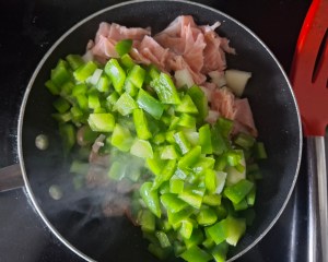 - Add veggies: Add diced pepper, onion, and ham to the skillet. Cook until vegetables are tender and meats are browned.