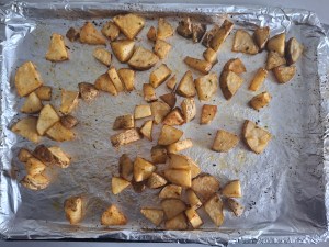 - Prep potatoes: Dice the potato into small cubes. Toss with olive oil, salt, garlic powder, chili powder, and parsley. Bake for 25–30 minutes or until tender and golden.
