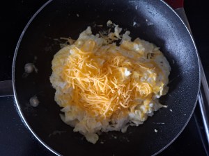 - Scramble eggs: Remove the meat mixture and cook your egg whites and whole egg in the same skillet. Once cooked, top with cheese and let it melt.